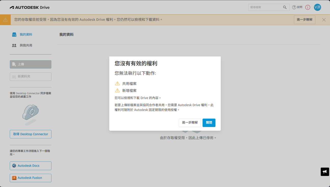 可以看到右上方雖然有登入,但由於該帳號不具備任何Autodesk產品授權,所以提示無法新增、共用檔案(只能檢視或下載別人共用的文件)